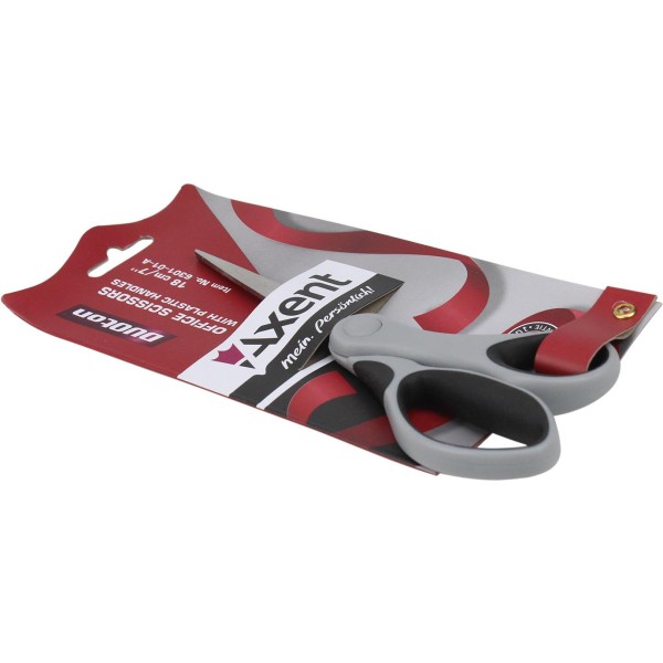 Офісні ножиці з пластиковими ручками - використовуються для різання паперу, картону, тканини та ін. Якісні матеріали та збірка, продумані деталі офісних ножиць Axent забезпечують комфортну, безпечну роботу і довговічність. Леза - з високоякісної сталі, міцні і стійкі до корозії, не потребують додаткового заточування. Кінчики лез закруглені для безпечної роботи. Леза щільно прилягають один до одного, забезпечують плавний і м'який хід. Папір розрізається легко і без зминання. Рукоятки з міцного пластику, стійкі до навантажень. Особливість ножиць серії Axent Duoton - асиметричні кільця ергономічної форми з гумовими вставками, що запобігають ковзанню пальців, забезпечують зручність і комфорт у використанні, і двоколірний дизайн в класичних кольорах Axent.
